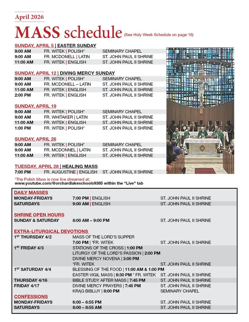 To foster Catholic identity in the spirit of St. John Paul II at the Orchard Lake Schools by providing liturgical celebrations and spiritual guidance to the internal community (students and staff) as well as outreaching the community at large and to promote Polish Catholic spirituality and traditions.